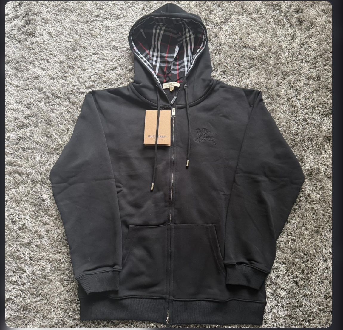 Brand new Burberry black full-zip hoodie with embroidered knight logo and iconic check-lined hood. Clean, timeless luxury piece. • Size Large • Brand new • Comes with original bag • Premium heavyweight feel