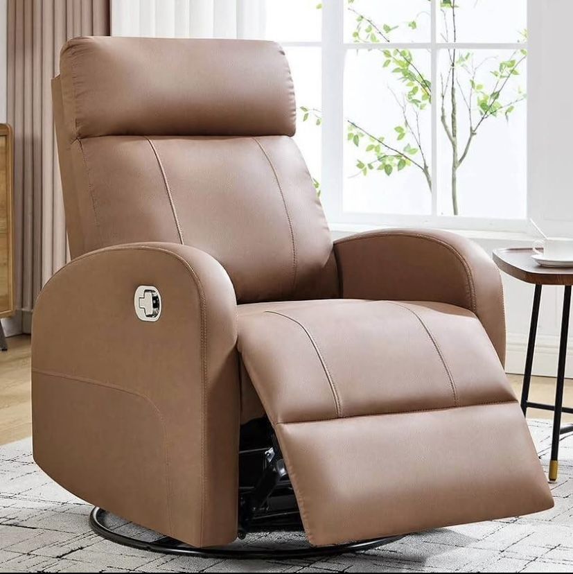 New in box SKU :LN-2319PU-COFFEE A SKU : LN-2319PU-COFFEE B Swivel Rocker Recliner Chair, Manual Faux Leather Recliner, Glider Rocking Recliners 360°Swivel Nursery Reclining Chairs with Adjustable Headrest Highback for Living Room, Coffee Brand HOMYKA Color Coffee Material Faux Leather Product Dimensions 36"D x 30.3"W x 40"H Size Manual Item Weight 93 Pounds 【Convenient Manual Recliner】Manual recliner with easy pull recliner switch. When you recline in the chair and pull the switch, the footstool pops out automatically and the backrest can be extended. When you sit up, the backrest will return with your body, push the footstool back with your foot and the recliner will return to its original state. 【360° Swivel & 30°Rocking 】The bottom is equipped with a rotating metal base, and the smooth and gentle; the closed metal ball bearings make the back and forth rocking experience for you and your baby smoother and more stable, and the characteristics of a rocker glider are more suitable Nursery and baby room. 360° rotation and rocking function are designed to provide you and your baby with full comfort. 【Extremely Comfortable】 This manual swivel rocker recliner chair is designed with a ergonomic soft headrest, backrest and curved armrests, which can deeply relax your head and provide good support for your arms. Fully filled with High-density thick sponge, the back and seat cushions are fluffy and soft. When you sink into the chair, you won't want to leave this recliner. Ideal for watching TV, taking care of your baby, sleeping and relaxing, reading and others. 【Excellent Safety & Stability】 Combined with classic structural mechanics, this recliner glide rocker provides excellent support and stability. The interior of the seat and armrests are made from solid polywood, which won't break easily, allowing you to sit safer and lie down easier. Such a strong structure provides stability and prevents rollover. It has passed rigorous thousands of cycle life tests and can support up to 350 pounds, ensuring long-lasting durability and stability. 【Easy to Assemble 】Our leather rocking recliner comes in 2 boxes, easy to pick up the package.