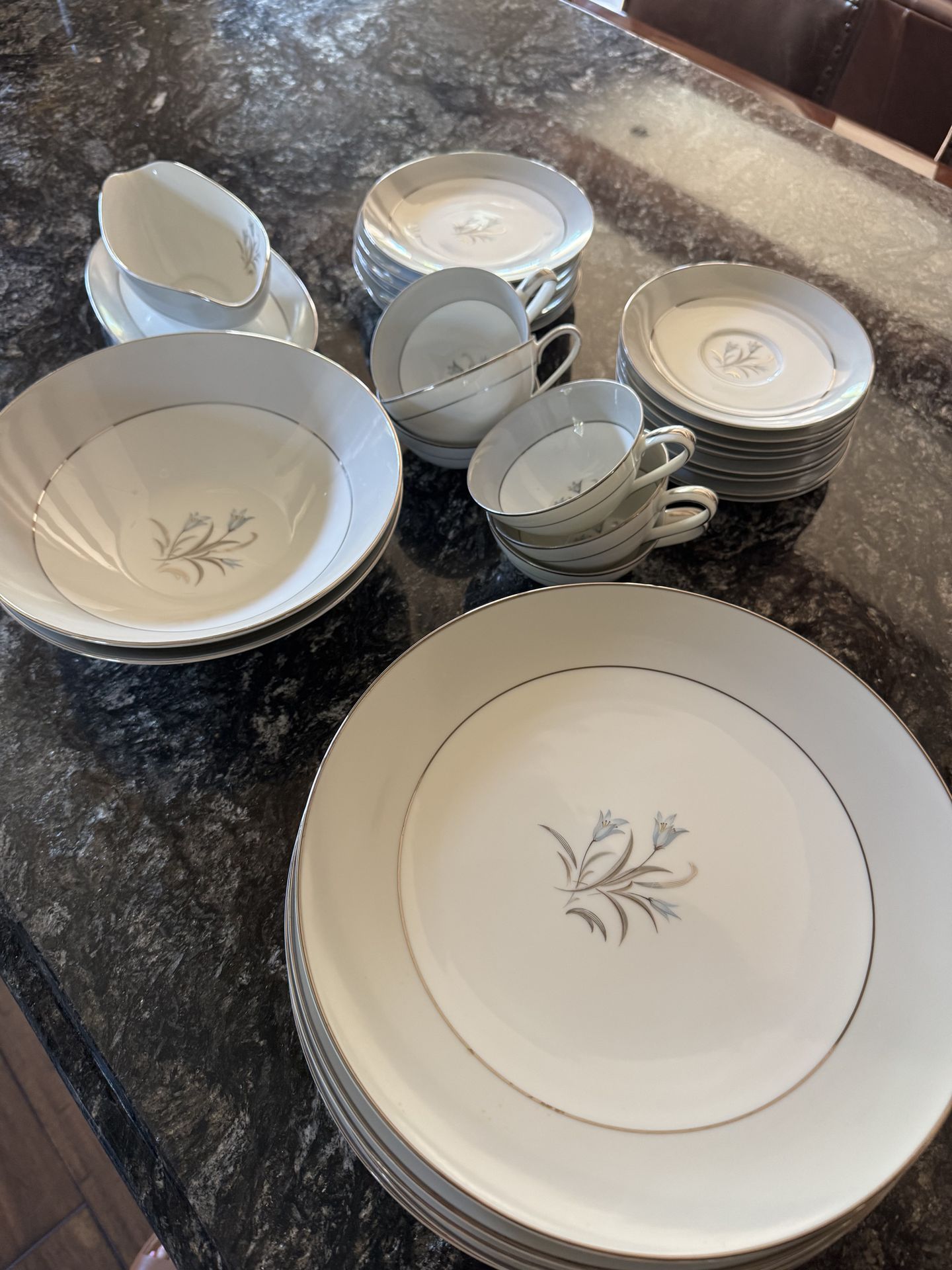 Vintage Noritake China Set from the 50’s in great condition Included is 7 dinner plates, 8 dessert plates, 8 saucers, 6 tea cups, 2 large bowls, platter, and gravy boat with attached saucer