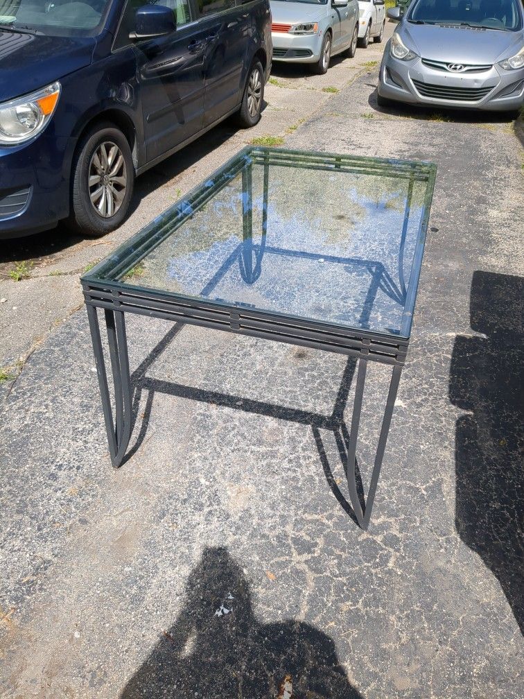 Glass top and metal frame able to be on a patio or inside. No chairs