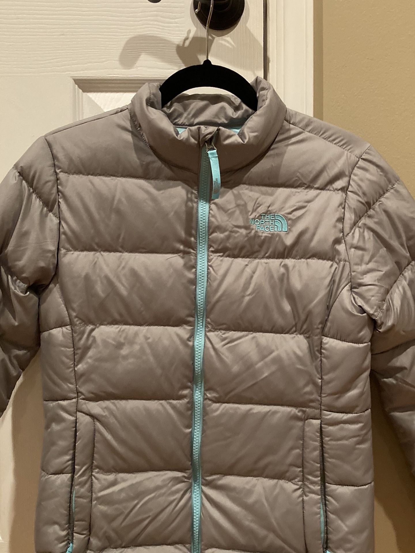 Girls North Face Winter Jacket Gray with Light Blue size large. Gently used condition with no tears, stains or rips. Great colors! Smoke-free and pet-free house.