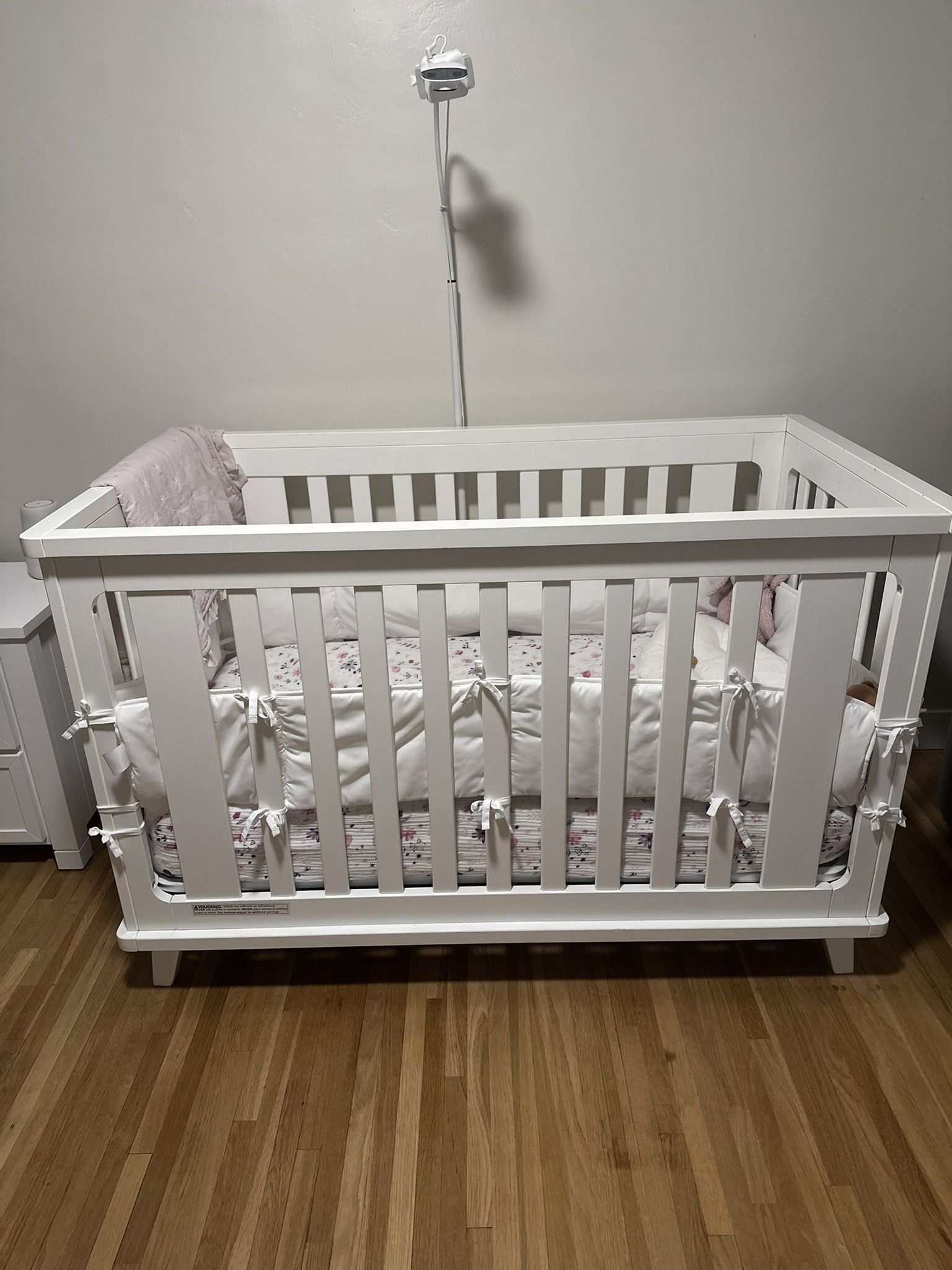 Baby white crib with mattress included it’s adjustment to baby as they grow so you can have high to medium to the lowest which is where it’s set up in pictures. It’s in great condition only had two small paint chip.