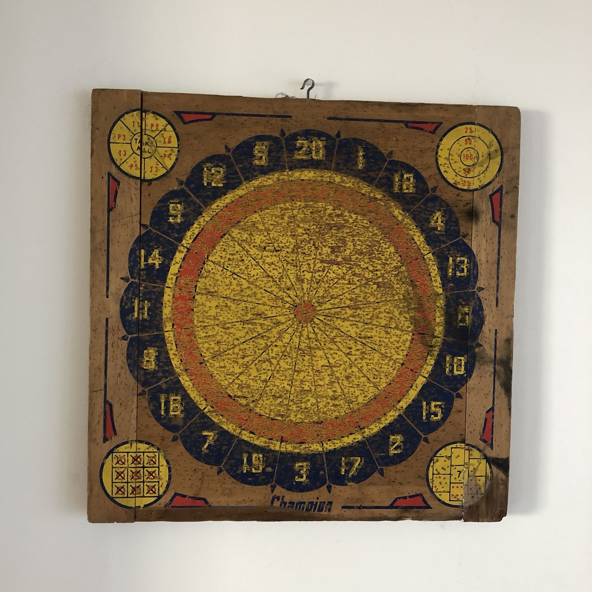 Colorful vintage dartboard by Champion, painted on solid wood with vibrant yellow, red, and blue sections. Features a variety of game targets including traditional scoring rings, baseball, and tic-tac-toe. Measures approximately 18” x 18”. Shows wear from use, with scuffs, fading, and visible cracking in the wood (see photos), but still holds strong as a unique and striking display piece. Cool vintage game room vibes. NOTE: This is an unframed board with no darts included. Available for shipping or free pickup in Hollywood.