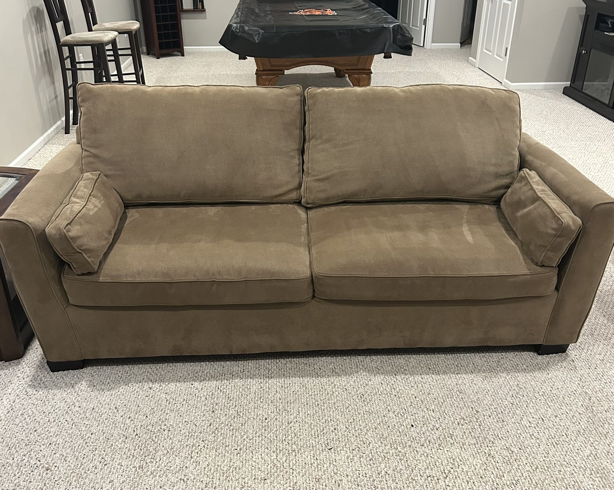 VGUC sleeper sofa. Sofa has never seen daily use, as it’s been in a guest area. Approximate measurements: 84” x 36” x 28”. Note: height of frame only is 28”, with cushions it’s more like 36”. Pull out sleeper bed is full sized. Dog friendly home, but dog does not go in this room/lay on this sofa. Non-smoking. **available for pickup 12/12** Located Mill Creek, Geneva