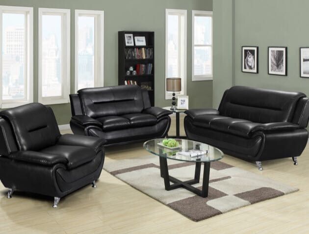 "New in box” Covered in rich Black Faux Leather. Built Stronger, Softer seating. Dimensions: Sofa - 75L x 30 x 35H Loveseat - 57Lx30x 35H Chair - 40L x 30x 35H “bringing elegance home”