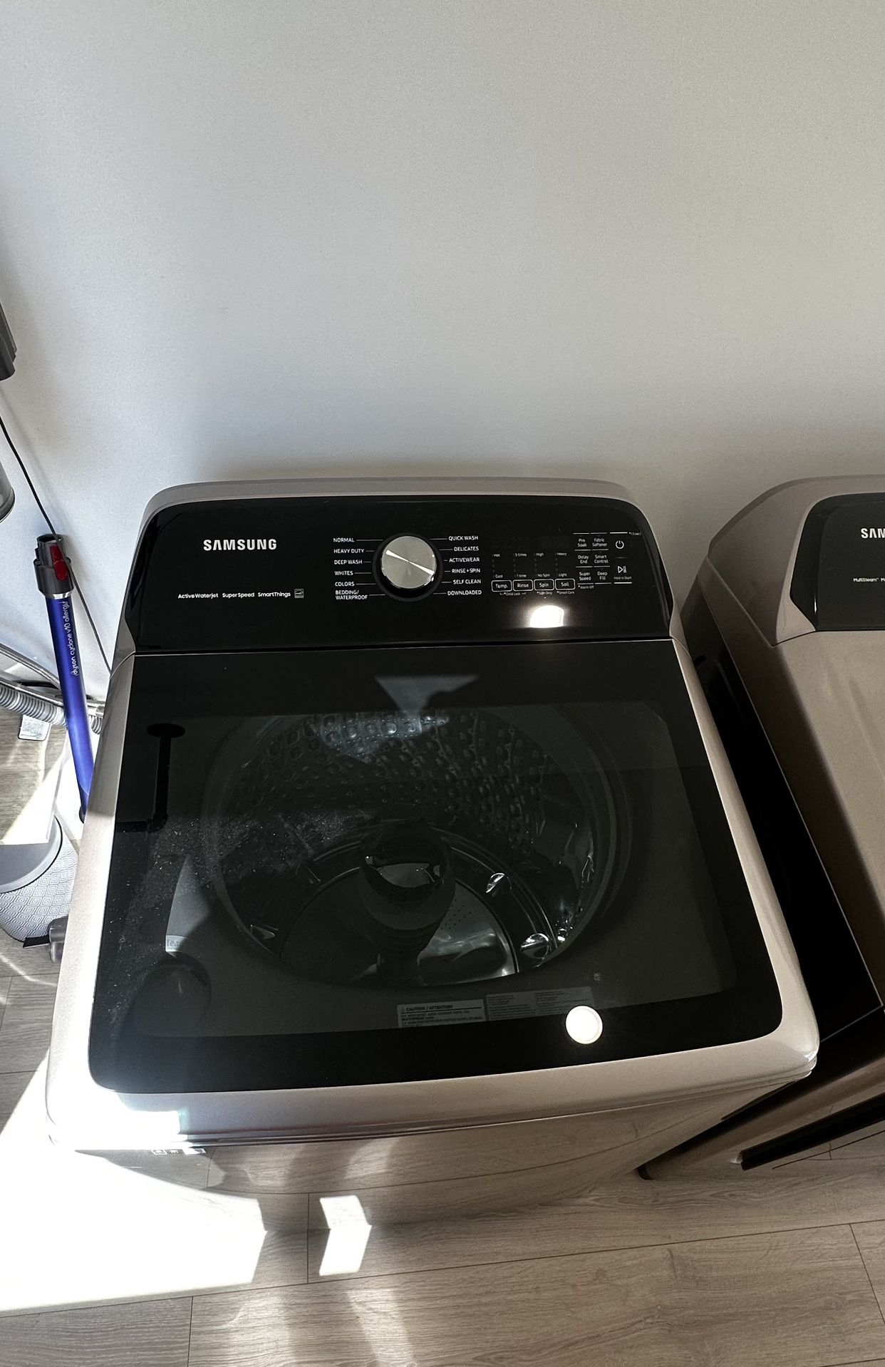 Samsung top-load washer with modern stainless finish and tempered glass lid. Clean, well maintained, and fully functional. Large capacity drum with center agitator. Multiple wash cycles including Normal, Heavy Duty, Bedding, Delicates, and Quick Wash. Features Active WaterJet and Super Speed options with digital control panel. ✔ Large capacity ✔ Glass lid ✔ Digital controls ✔ Multiple wash settings ✔ Clean interior ✔ Fully functional