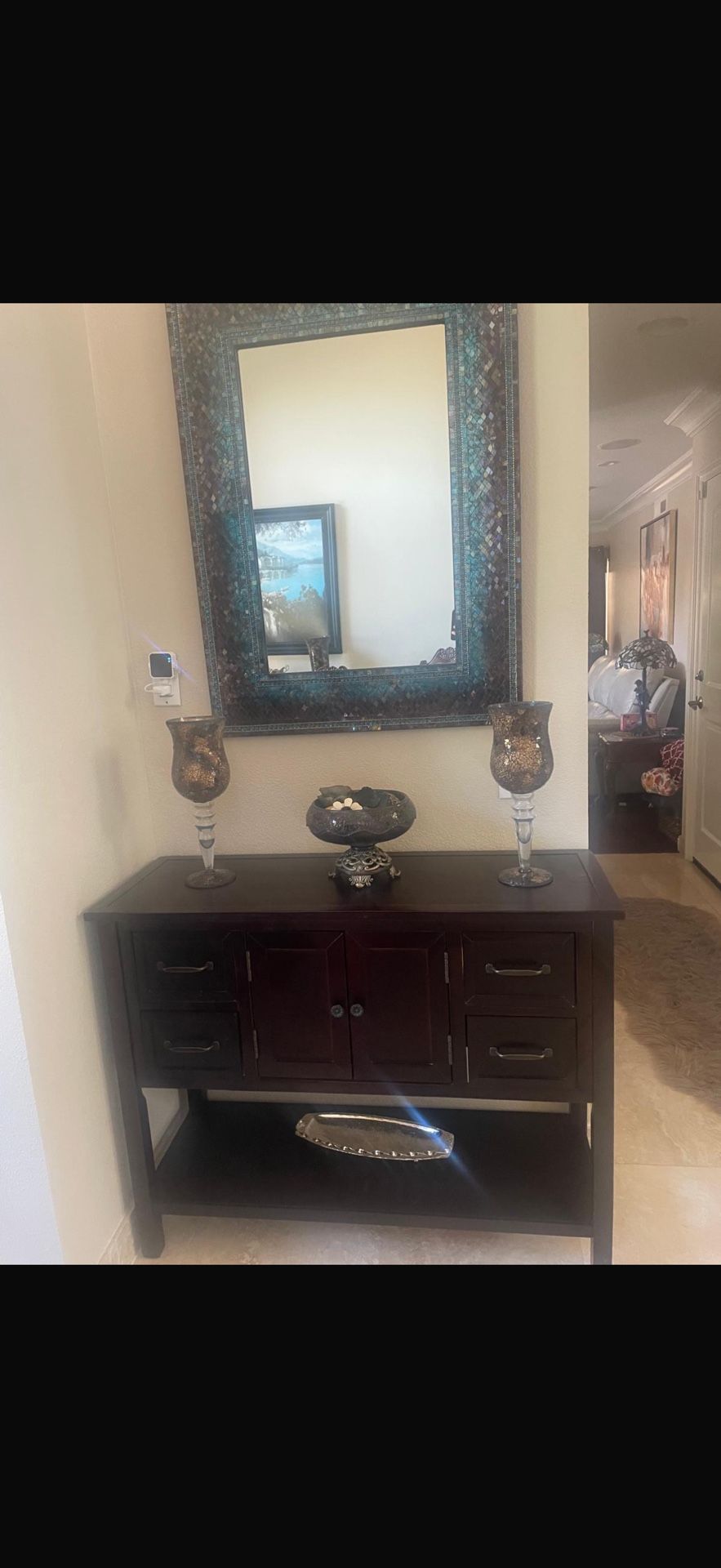 Beautiful decorative wall mirror featuring a blue and bronze mosaic frame that adds a touch of elegance and color to any room. The reflective glass is clear and high quality, and the frame’s shimmering tones make it a stunning accent piece for entryways, living rooms, or bedrooms. Details: • Frame: Mosaic design with blue, bronze, and metallic tones • Condition: Excellent — no cracks or scratches • Orientation: Can be hung vertically or horizontally • Dimensions: (30 width × 40 height) • Style: Modern / Transitional / Artistic A perfect statement piece that catches light beautifully and enhances any décor.