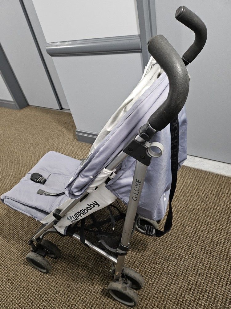 UPPAbaby G-LUXE stroller, gray fabric. Lightweight and easy to fold. Used condition, some wear and tear.