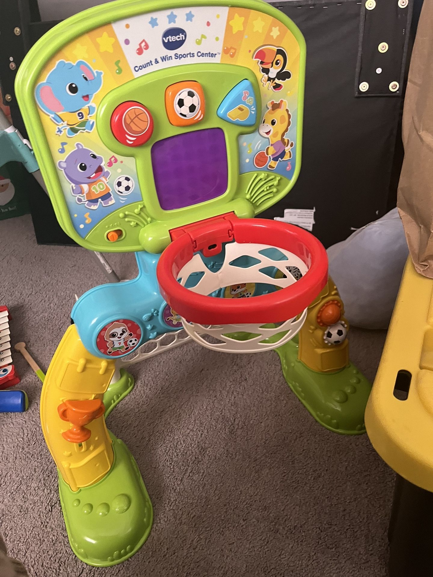 Small kids toy Includes small basketball and soccer ball Works fine, may need new batteries has been unused for a few months Will include spinning toy that has music