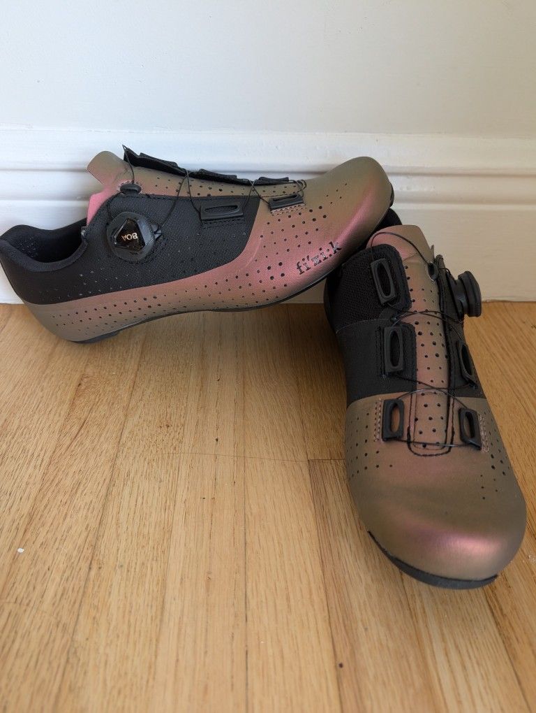 Great condition. Nothing wrong with them. 8 3/4 or 41.5. used 2 times. A versatile performance road shoe with expert styling Asymmetric cuff opening enhances fit and improves comfort Iridescent finish appears different hues from different angles Laminated mesh upper offers breathability and support BOA dial secures quickly and precisely Carbon-infused sole keeps your power to the pedals
