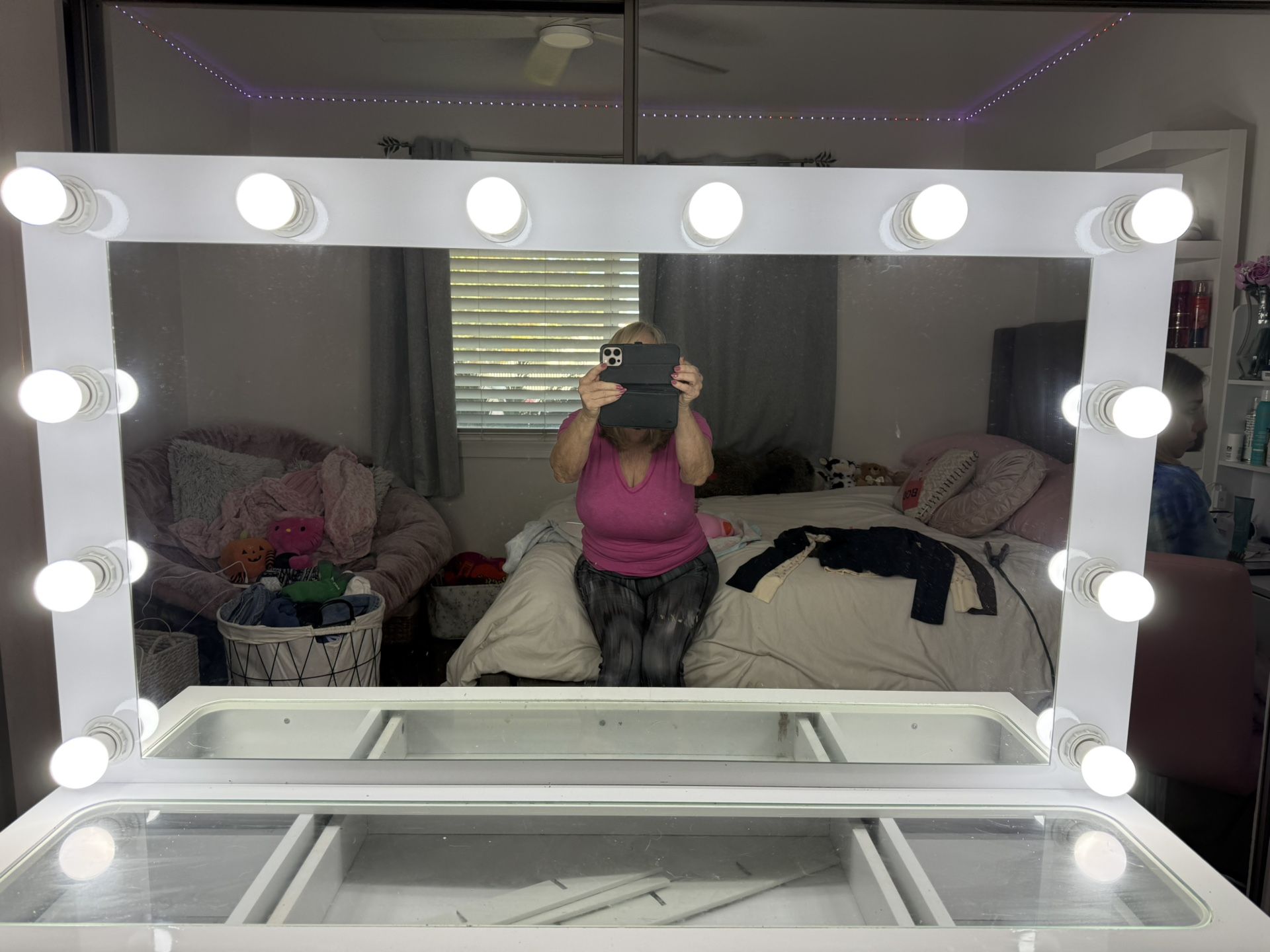 White vanity, bright lighting, glass top 47” wide 15”deep 56” high