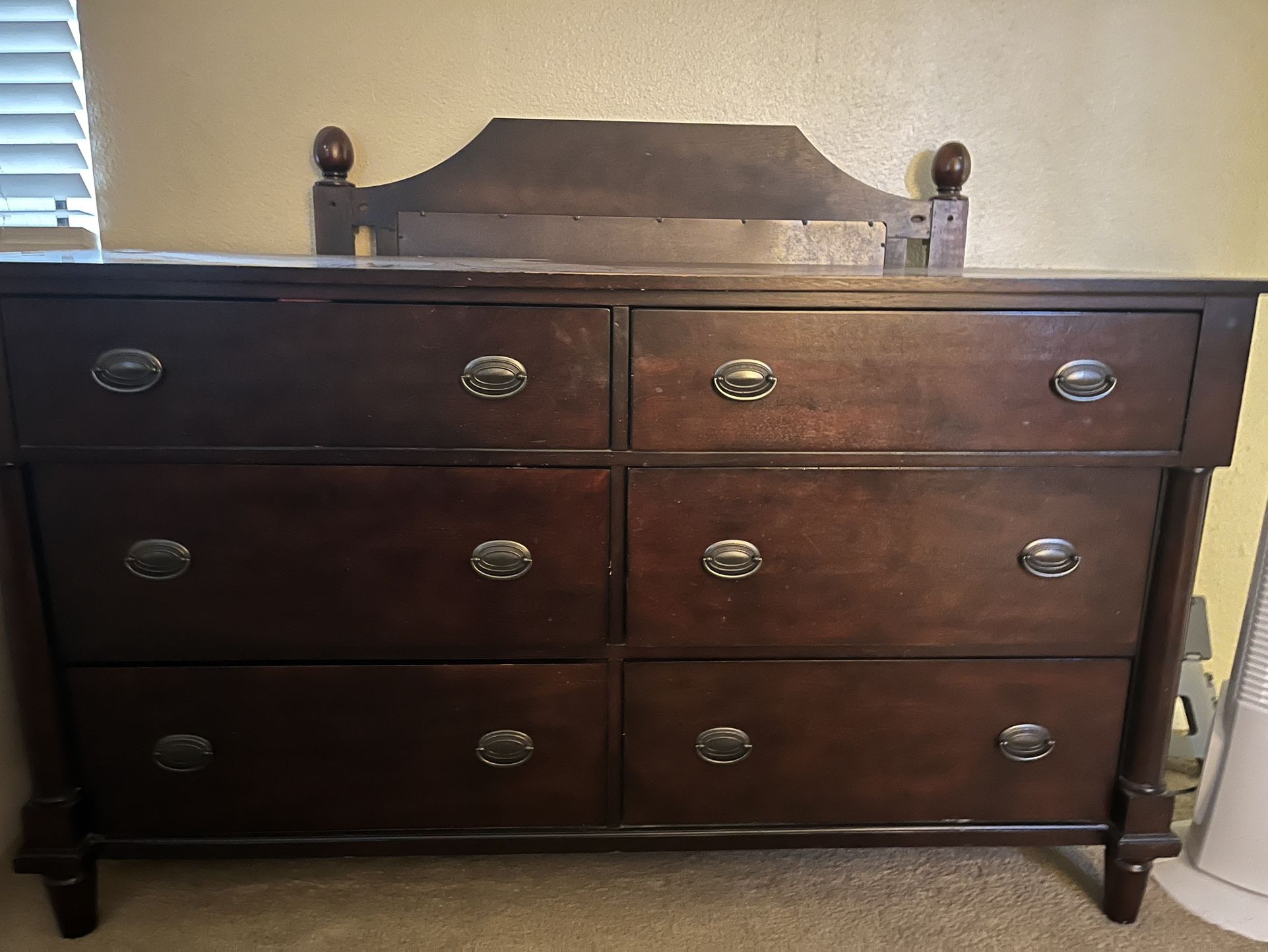 Dark wood 6 drawer dresser with or without mirror but missing mirror attachment and screws. Minor scratches/scuffs on the top/edges…$100 obo must pick up