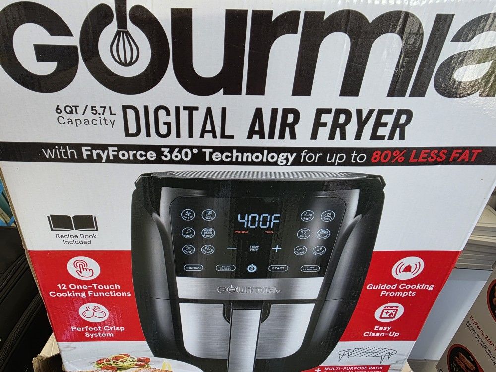 Gourmia Air Fryer Oven Digital Display 5.7 L Large AirFryer Cooker 12 Touch Cooking Presets, XL Air Fryer Basket 1500w Power Multifunction Stainless Steel FRY FORCE 360° (6 QT)
