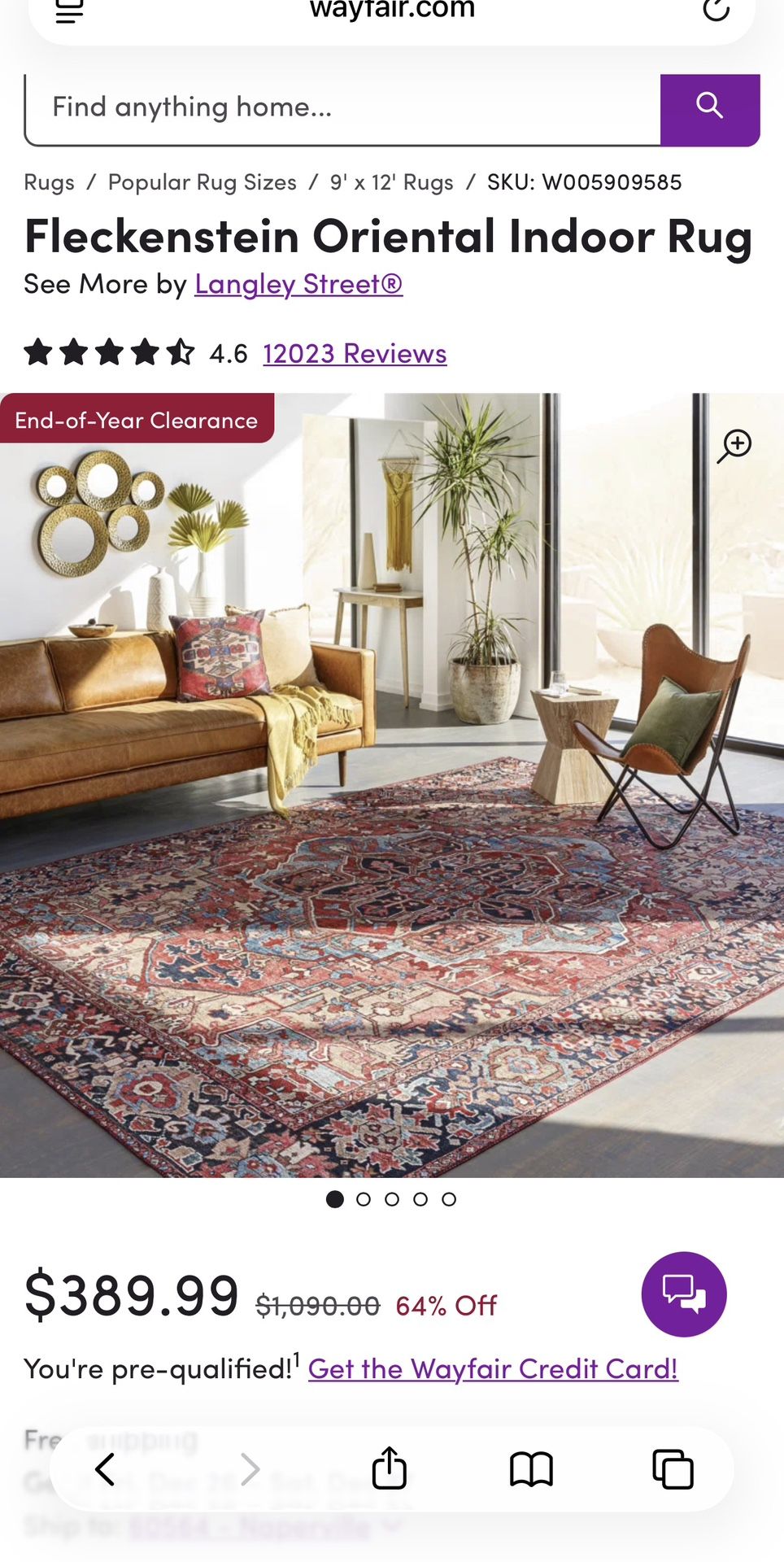 Purchased from Wayfair last year. Large rug size 10’ x 13’. Selling it as the pattern no longer fits in my living room decor. The bed frame on the rug is the actual picture taken of the rug in my living room, where you can see the print. It looks vivid in the pictures but honestly it’s a meh! for me. Perhaps you might like it. :)