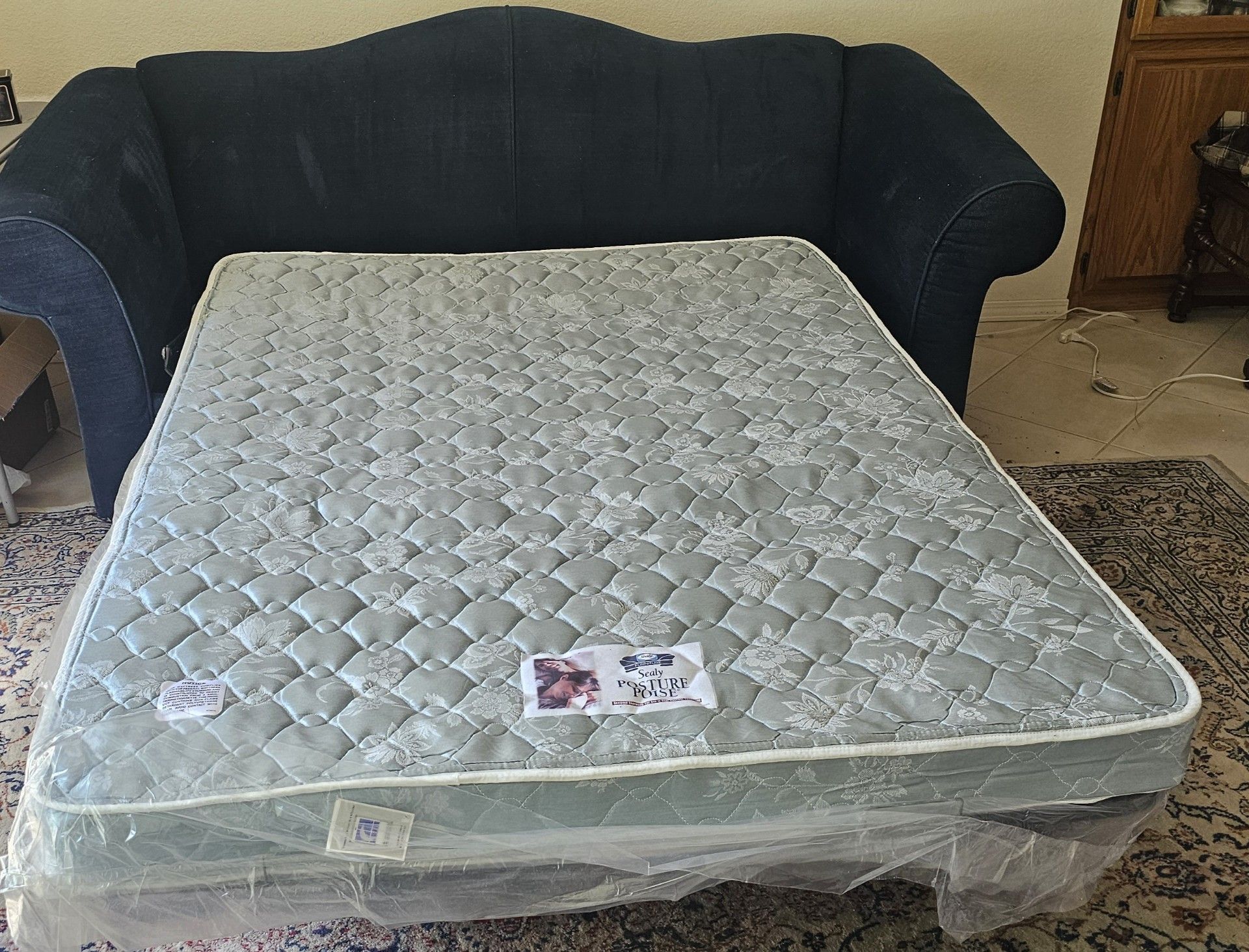 Seally brand. Pull out sleeper sofa in great shape. This was covered with blankets for its lifetime. Has original plastic on v Back of mattress and was likely slept on about 5 or 6 times. Upholstery in good shape. Dimensions are in pics.