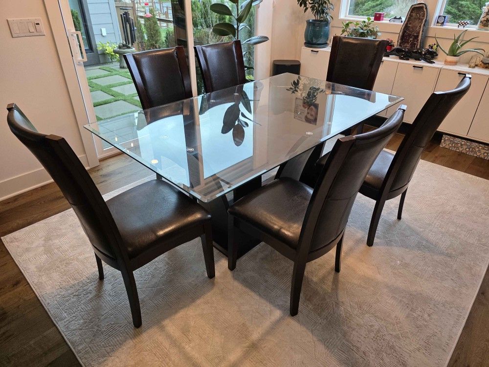 72x42 6 chair dining set with glass topped table and six padded chairs and storage