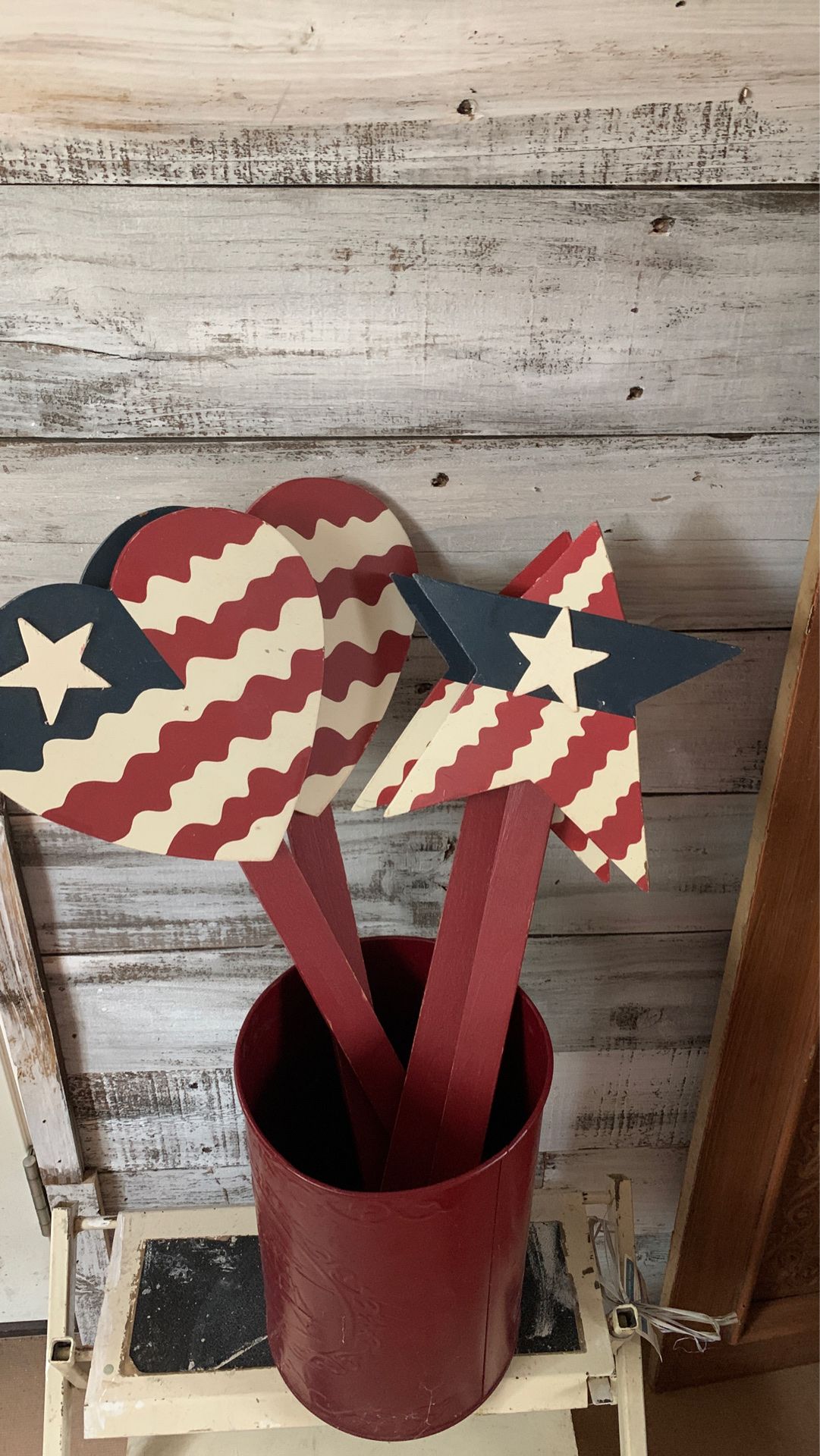 2 hearts and 2 stars red white and blue mounted on stakes . Great decorations for the fourth of July. All 4 sold together