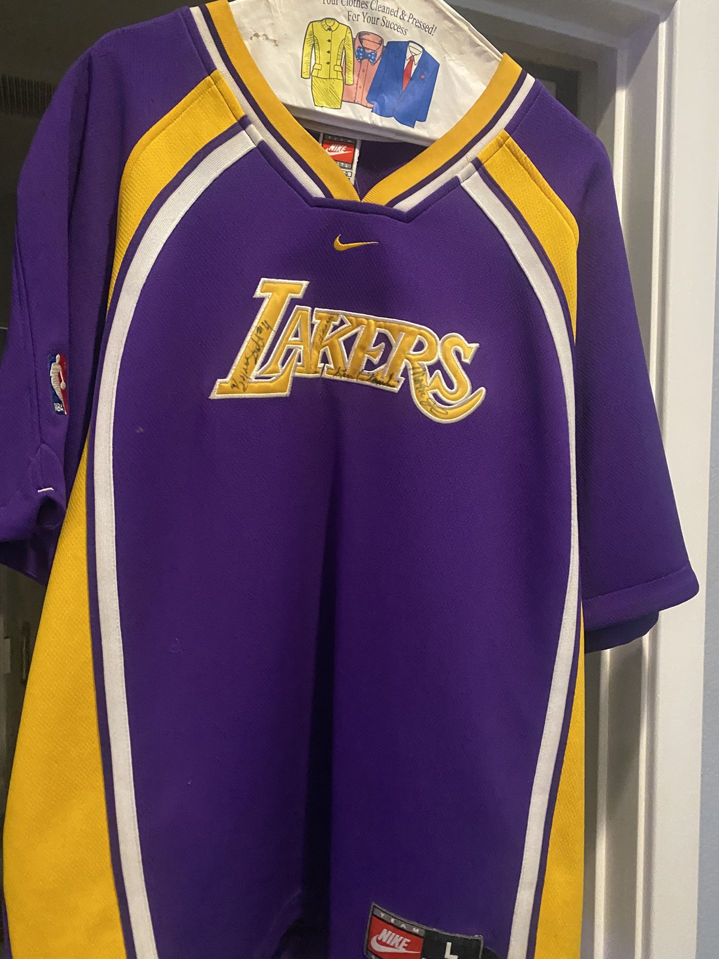 Lakers Nike autographed authentic Jersey (L) Purple signed by Magic Johnson, Chick Hearn, Kurt Rambis and Byron Scott It’s a must have for Laker lovers and collectors
