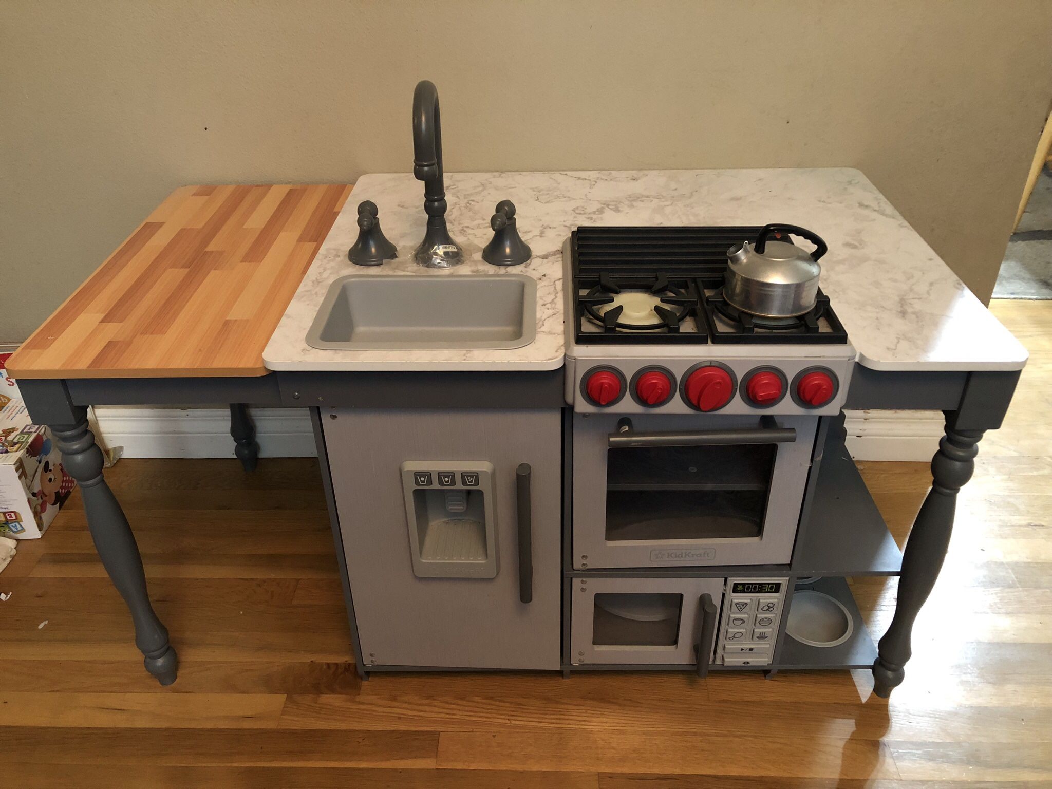 Play kitchen with counter space that makes sounds when you “turn on” the stove, use the microwave, it dings when the oven food is done and makes sounds of ice cubes falling into a cup from the mini fridge. Pick up in Mountlake Terrace. Was over $200 new