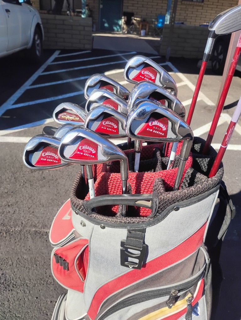 Very Nice Condition Men's Callaway Complete Golf Set, Right Handed Clubs, 12 Clubs Total, Regular Flex Shafts. Callaway Razr X Driver, Callaway Razr X 3 Wood, Callaway Razr X 5 Wood, Callaway Big Bertha Iron Set 3-PW,AW,SW, Nice Bombshell Putter. All Comes In A Callaway 14 Slot Cart Bag. Comes With Headcovers. Great Clubs!