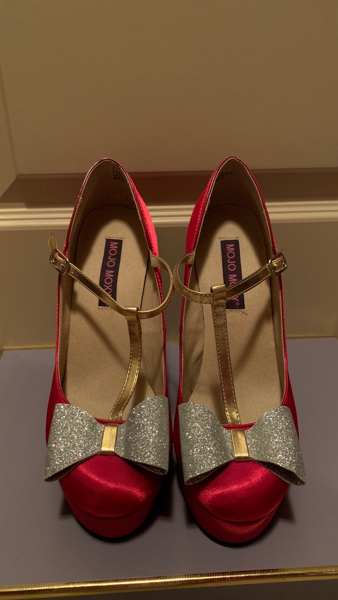 Mojo Moxy hot red pumps with gold straps and silver bow. Size 7. Great condition