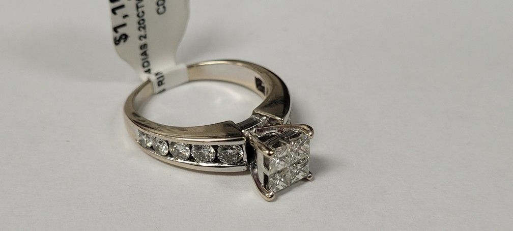 I am selling a kay jewelers engagement ring. It is 6.3g 14k white gold size 8. The top diamonds are 4 30pt princess cut stones and 10 rounds stones on the side totaling 2.20ctw.
