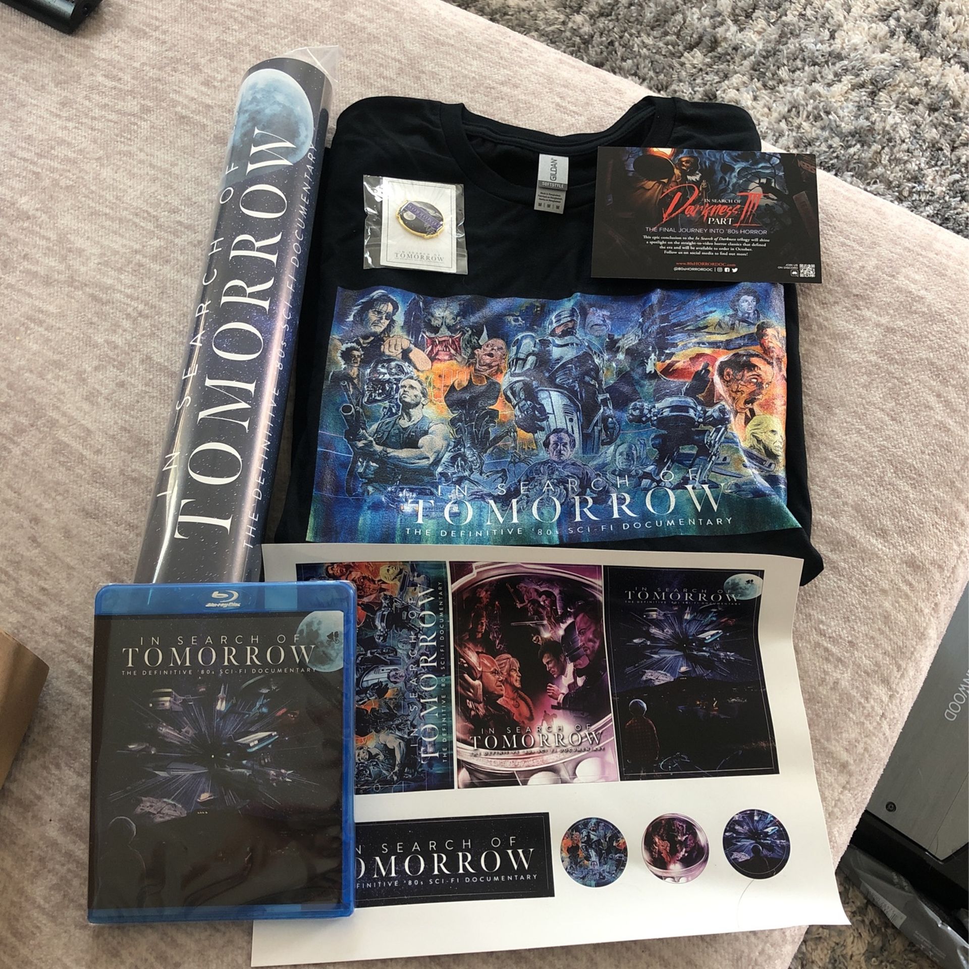 In search of tomorrow T shirt size medium, poster, stickers, pin and DVD. Brand new never opened