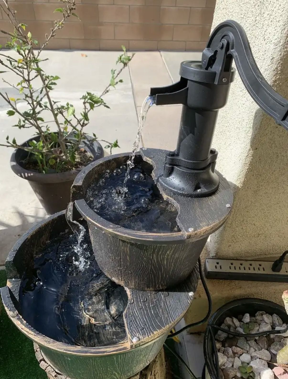 Two-tier outdoor/ indoor water fountain with pump handle. Alpine Corporation 27" Tall Rustic Outdoor 2-Tier Barrel Pump Water Fountain with Soothing Cascading Water Flow for Patio, Yard, Porch, or Landscape, Bronze