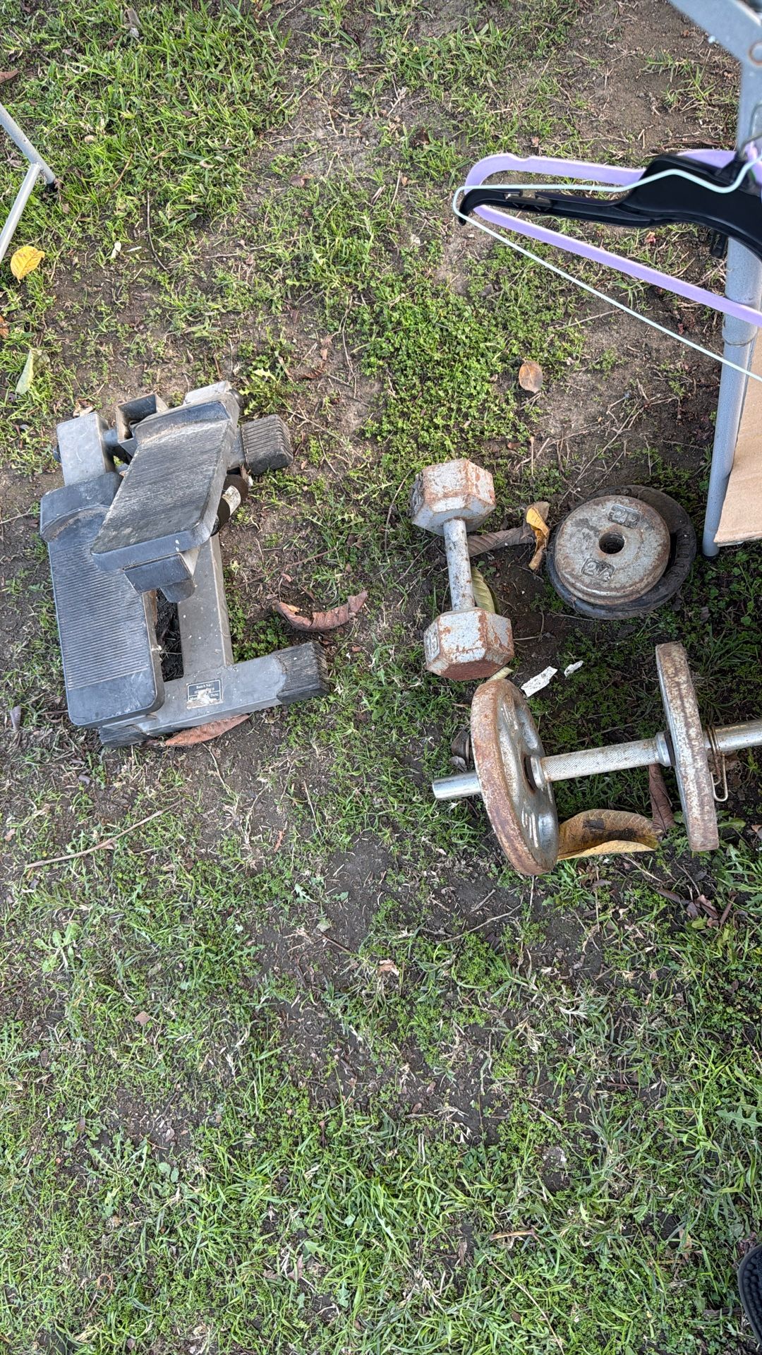 2 dumbbells one is adjustable with 4 extra plates and a mini stair stepper.