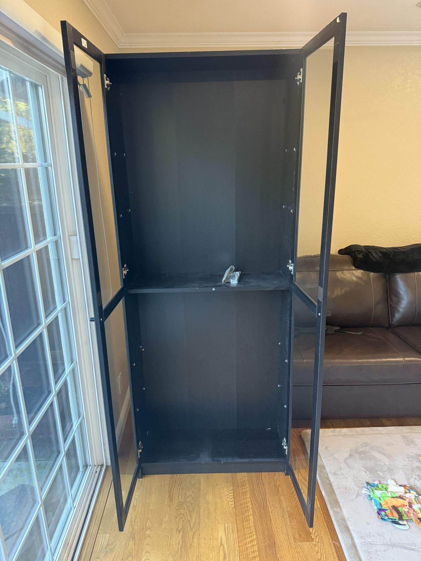 Black display cabinet with clear doors. Shelf’s included just not pictured as we just moved. Cash, local pickup, exact change only.