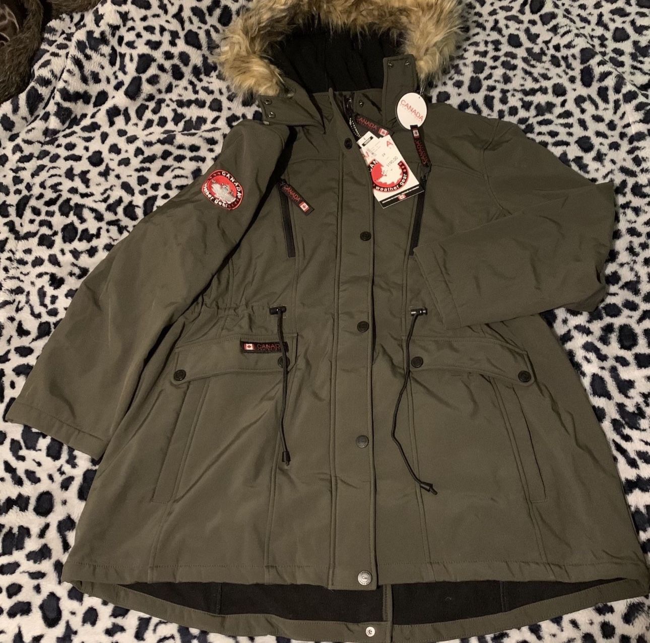 Canada Weather Gear Womens Waterproof Coat Parka Faux Fur Jacket Size 2X Detachable hood New with tags Olive with Natural fur Waterproof Zip up with front button closure Back snap vent on bottom hem Back gathering outside and Elastic inside for the perfect fit Machine washable - except the fur