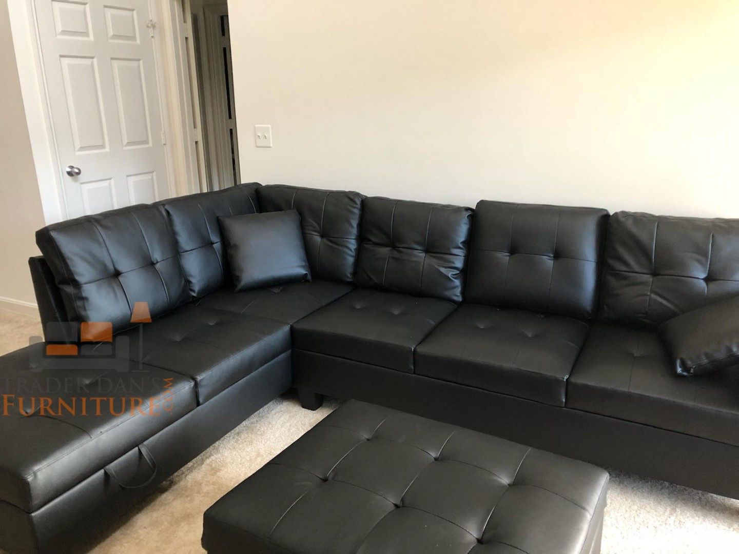 Brand new black faux leather Sectional Sofa with storage ottoman and storage chaise and cup holders and 2 accent pillows. Comes new in 4 boxes. Assembly required. Left facing chaise. 84x112x34h. Delivery π for additional fee. Firm price