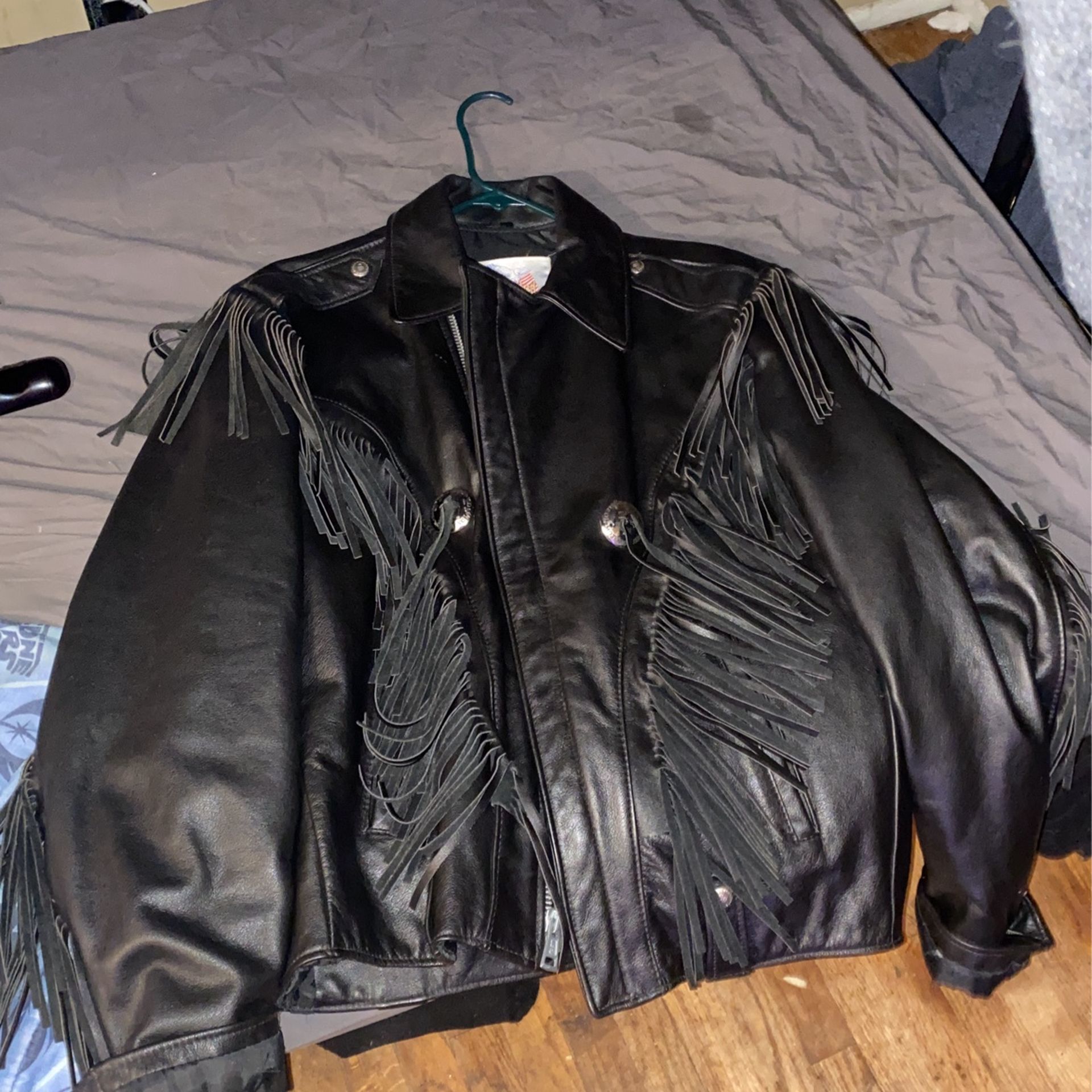 Size 42T looking for best offer I am willing to sell with size 10 Harley boots if you want them or one of the leather vests I’m willing to go down to $60 but that is the lowest I can go for the jacket by itself