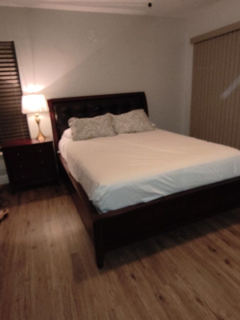 A used queen size bed frame and one nightstand for sale in good condition. You will need to provide your own mattress (the mattress in the photos IS NOT included).
