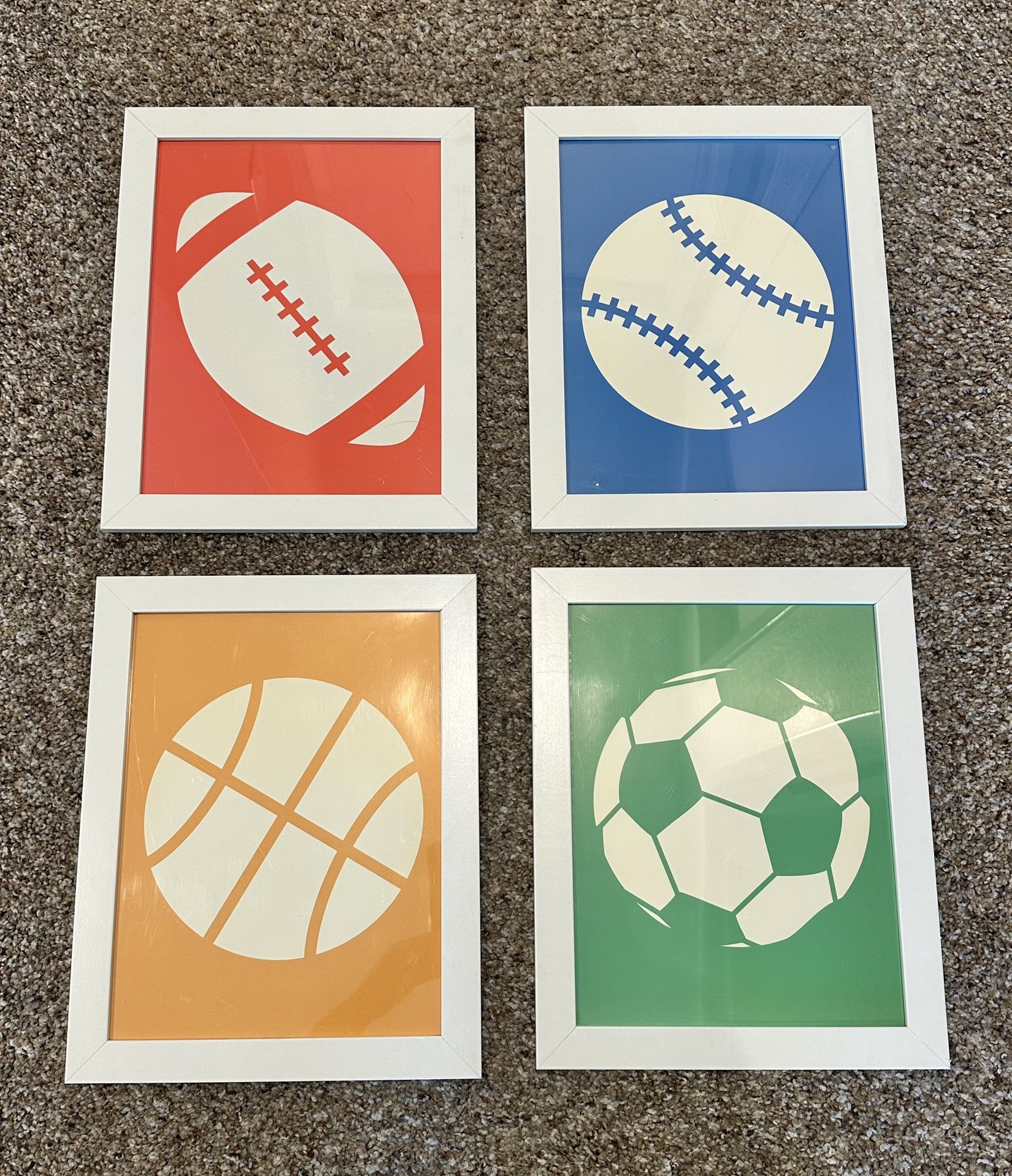 Custom Designed Sport Art. White Frames. 8.5x11 - 4 pieces included. Football, Soccer, Baseball & Basketball. Fun art for baby’s room, kids room, playroom… Great condition.