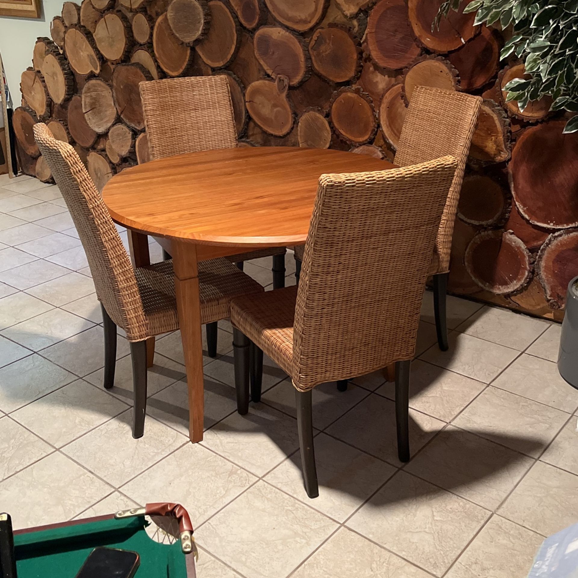 Very nice wood dining table set with with 4 wicker chairs. The chairs are very sturdy. Also the two sides on the table drop for an extra space and is very convenient for small places. Dimensions when the table is full 42” , and when the two sides drop is 26” wide by 42” long