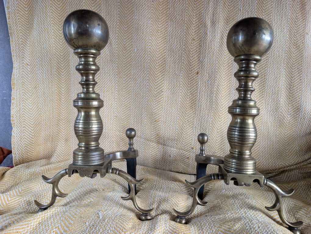 Solid brass Victorian cannonball Andirons made by the Harvin Company.The tops of the andirons are solid brass with a cannonball like shape to them.The bottoms have detailed scroll work on the legs in the front .They are made of all brass which makes them very heavy and sturdy and a good statement piece selling as a pair asking $500 OBO for the pair . ***** Delivery available for a small fee depending on location