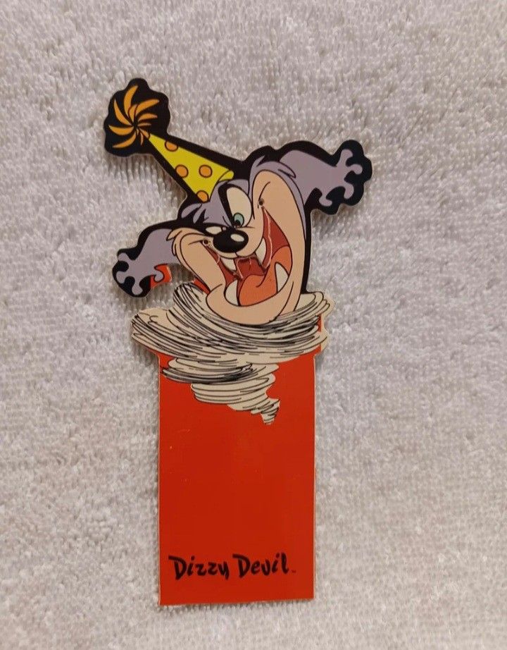 5 inches tall & 3 inches the widest part . Vinyl material . Featuring tiny toon adventures character Dizzy devil ( baby taz ) twirling & wearing a birthday party hat . Gift idea for collectors or addition to your desk , office . Book bites is a registered trademark of Flair Licensed & Design Inc. Made by OSP Publishing inc for Warner brothers in 1990