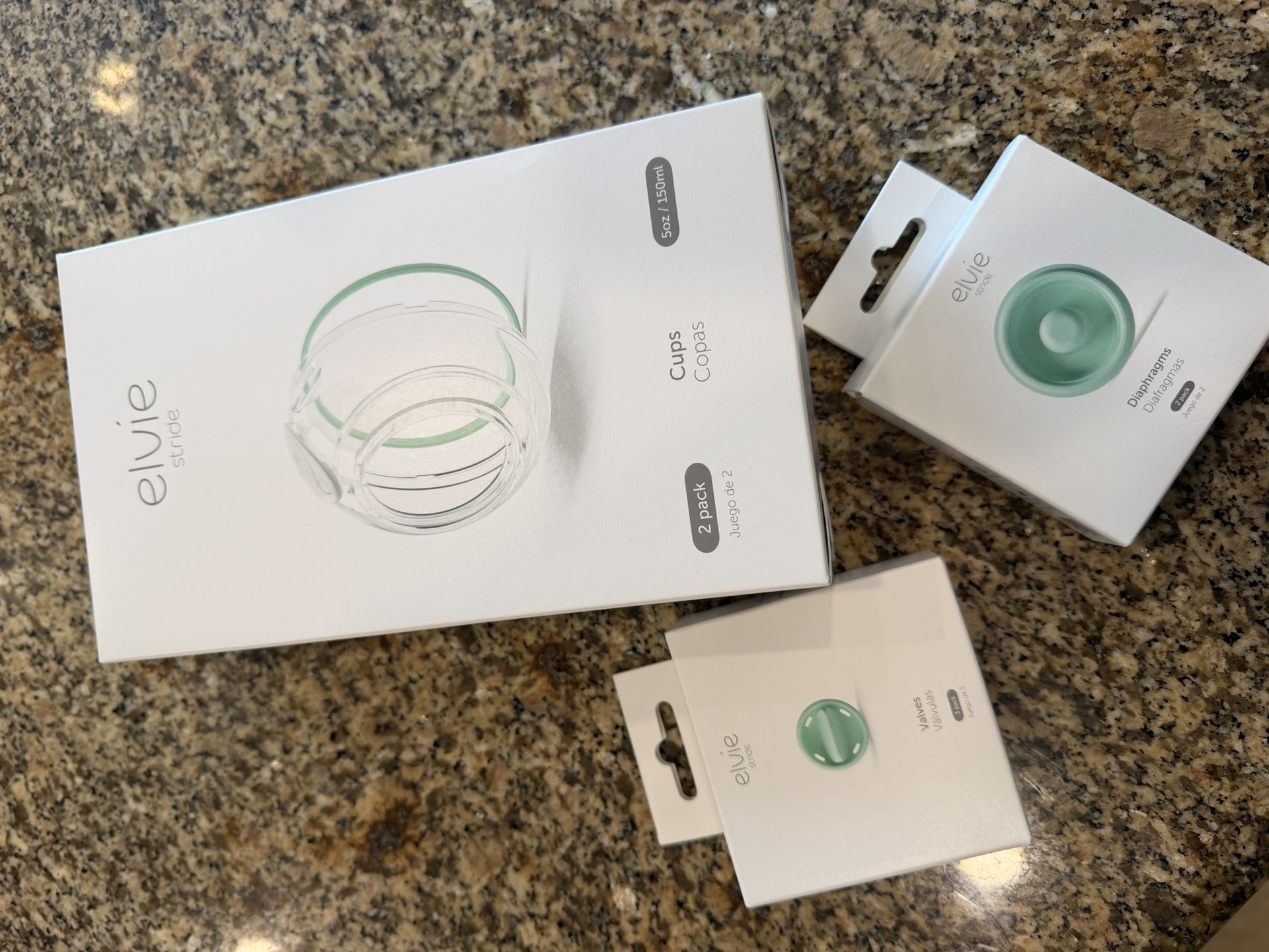 Elvie Stride accessory bundle. Includes: • 2 pack Cups (5oz / 150ml) • 2 pack Diapagms • 2 pack Valves Compatible with Elvie Stride pump. New