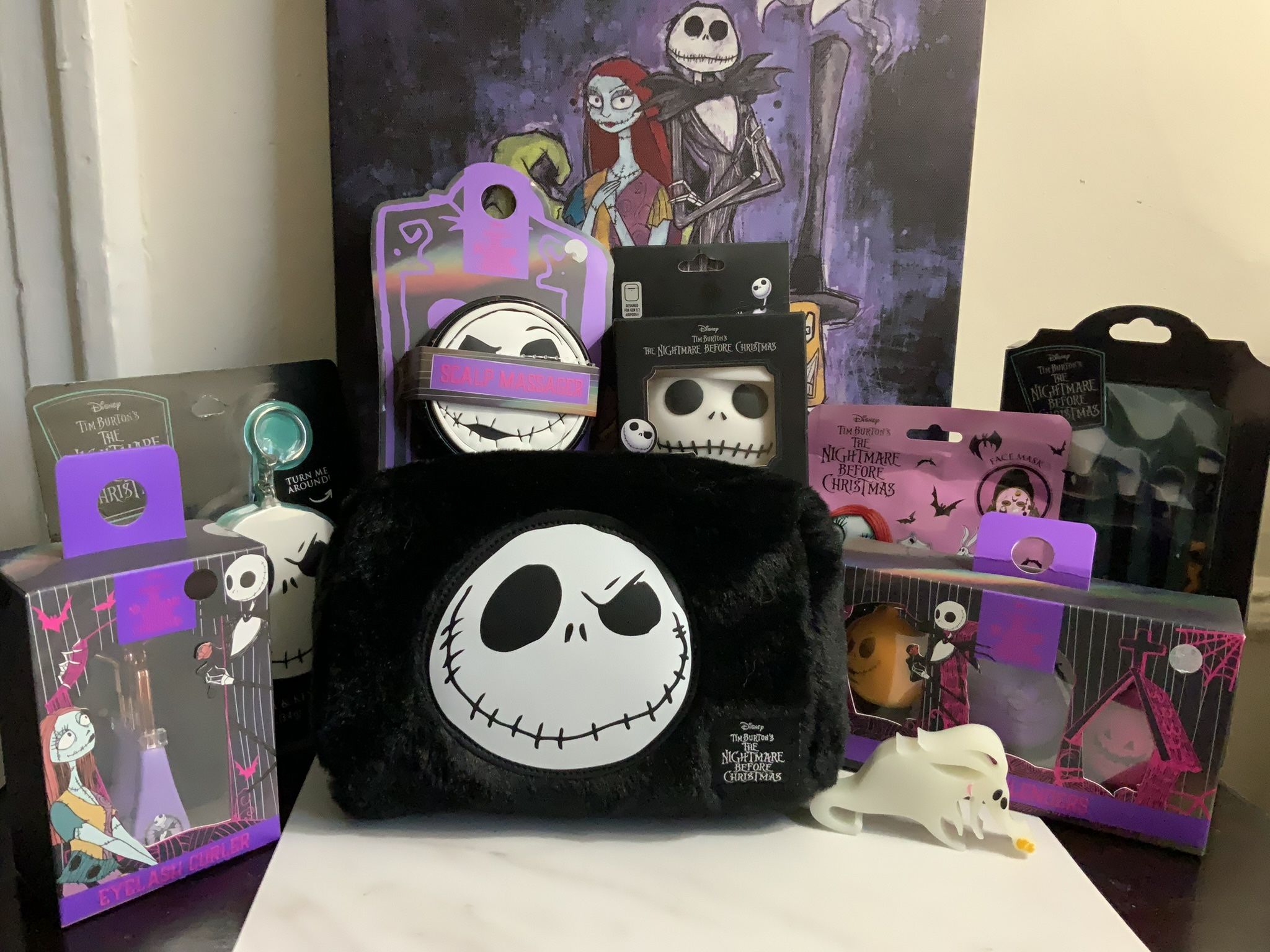 Nightmare before Christmas beauty sent this is good for a gift or if you want to treat yourself to something. This, it comes with three beauty blenders, a set of four cosmetic brushes, beauty, mask, eyelash curler, massage scalp, her, and lip balm with a jack Skellington keychain