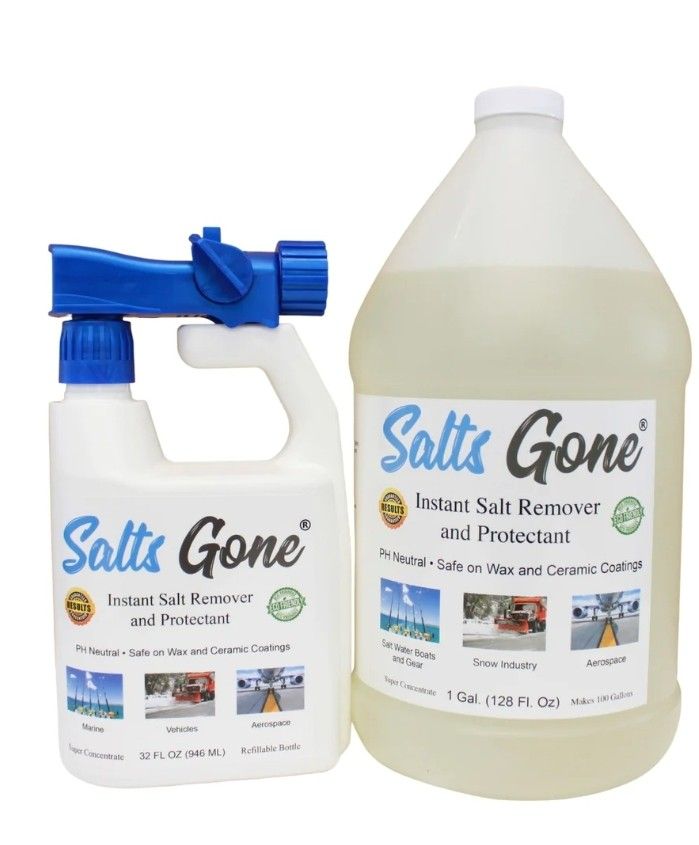 Also have 2 quart refills available $30 each Purchase all products for mega deal discount! 32oz Hose End Sprayer $25 To Use Hook up a standard garden hose and start rinsing with Salts Gone. The 32oz bottle comes full of concentrate and ready to use. Wet surface thoroughly with product and allow to stand for at least 30 seconds. Rinse with clean water. Salts Gone can be rinsed off or left on the surface. Please note that if you are not rinsing, water spots may occur on dark colors until the surface is rinsed again. Gallon $60 To Use Refill for hose end sprayer, pump sprayer or other applicator of your choice. Wet surface thoroughly with product and allow to stand for at least 30 seconds. Rinse with clean water. Salts Gone can be rinsed off or left on the surface. Please note that if you are not rinsing, water spots may occur on dark colors until the surface is rinsed again. Proportioning If using to refill Salts Gone 32oz Hose End Sprayer, DO NOT mix with water. If using in pump sprayer or other applicator, mix with water at 1:100 Ratio (1.28oz per gallon of water). Key Features Makes 100 gallons of solution Removes salt and brine instantly Can be used in any pump sprayer for low temperature applications