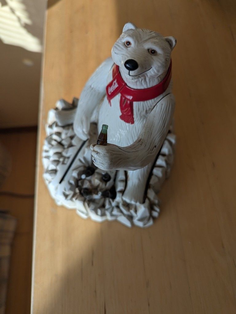 Vintage Coca-Cola Polar Bear Mechanical Coin Bank distributed by The Ertl Company and officially licensed by The Coca-Cola Company (© 1995). This is the mechanical “drinking” version — the bear’s right arm functions as a lever, lifting the Coke bottle toward its mouth when operated. Coins drop into the base and are retrieved through the bottom access door. • Fully mechanical (no batteries required) • Official Coca-Cola licensed collectible • Solid construction with molded ice base and bottle details • Classic 1990s Coca-Cola polar bear design Condition shows normal wear consistent with age, including surface dirt in crevices. Please review photos for details. A great piece for Coca-Cola collectors, holiday décor, or vintage advertising displays. Cash/Venmo preferred. $95 or best offer
