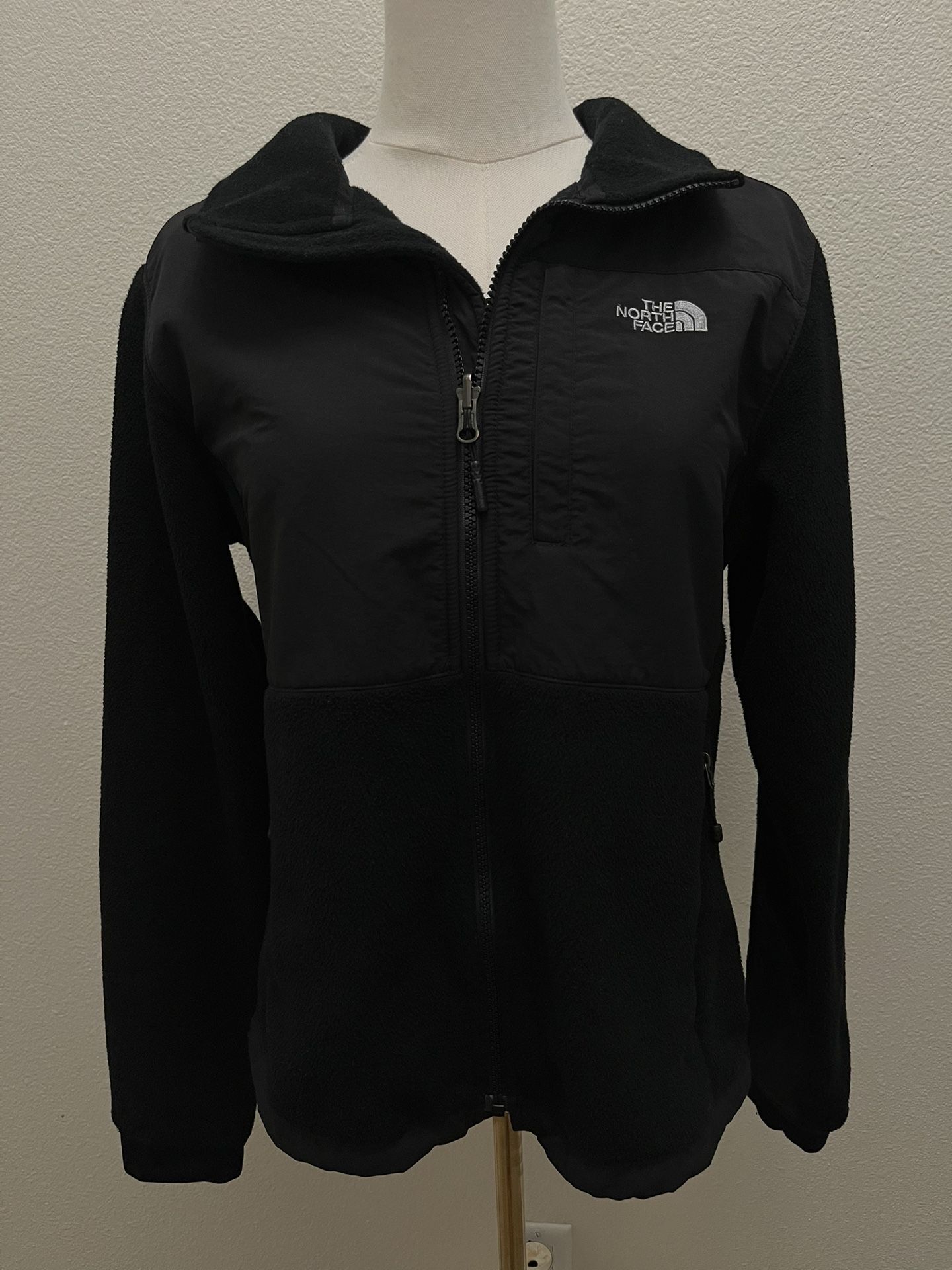 Women’s The North Face hybrid fleece jacket in black, size Small. Features a soft fleece body with insulated/woven panels on the front and shoulders for added warmth. Lightweight, comfortable, and perfect for everyday wear, hiking, travel, or layering. Details: • Full zip front • Zippered hand pockets • Chest zip pocket • TNF logo front and back • Color: Black • Size: Women’s Small (S/P)