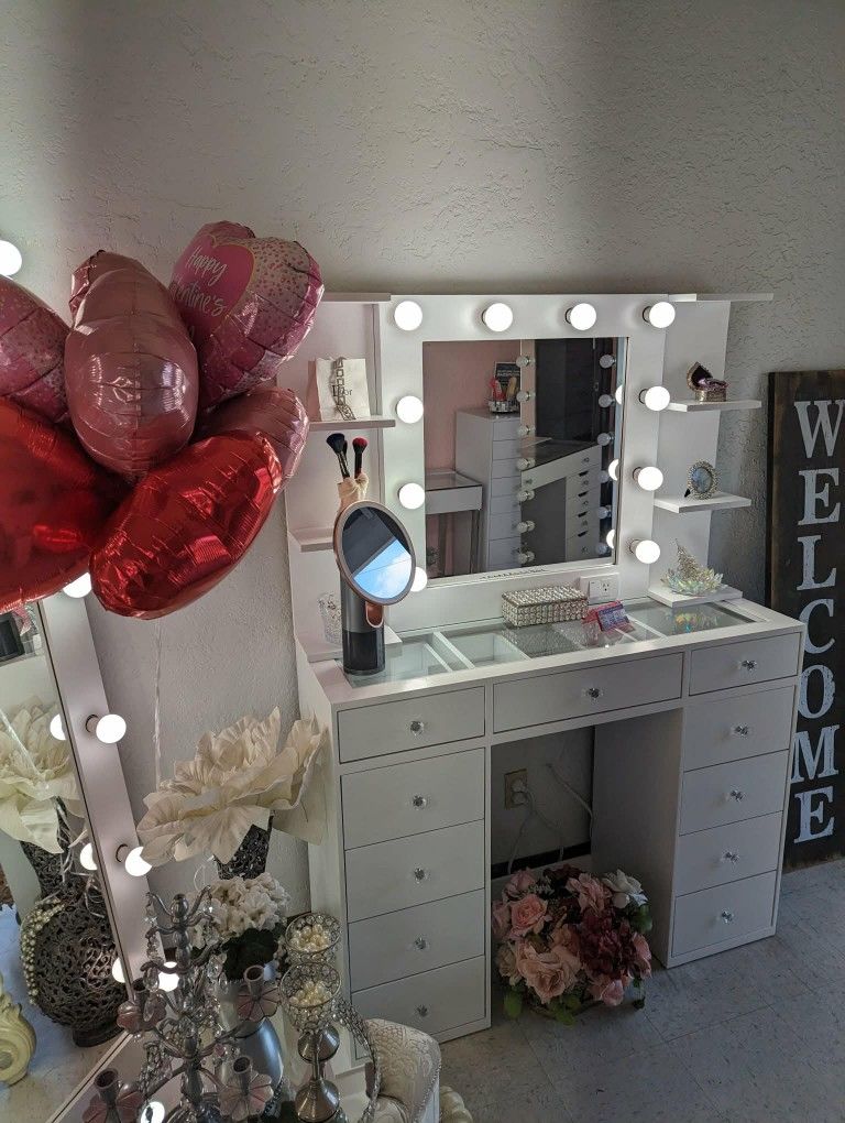 FREE LOCAL DELIVERY special !!!!Price is FIRM‼️ Already assembled ❗️ Measurements: Desk 48”Wx 36”H x 16”D Mirror with lights 30"x32"+2 stands ( chair not included) zelle, venmo I speak Spanish. #vanityset, #makeup, #dressing table, #hollywoodmirror, #glasstop, #crystalknob We are located in the Walnut area, CA 91789.