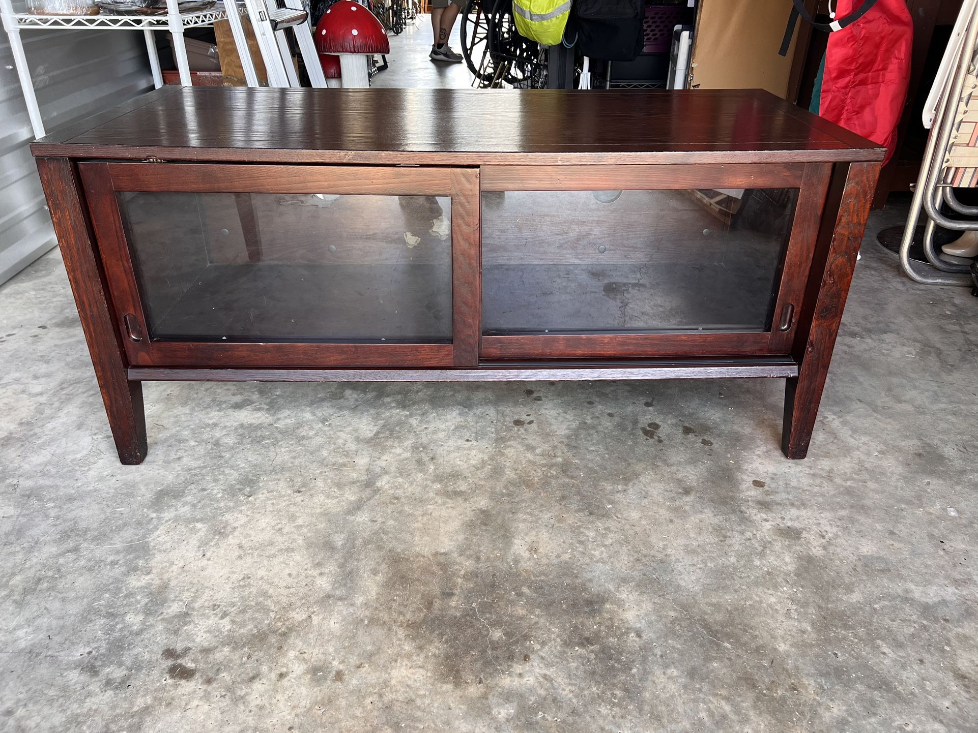 Beautiful, simple and elegant. This solid wood tv stand goes great in any living space. Has two sliding doors for storage and outlet holes on back for easy cable transfer. Very sturdy & heavy. Must pickup. 21in (H) 46in (W) 20in (D)