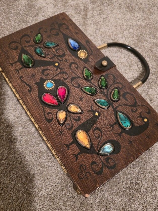 Vintage 1965 Enid Collins of Texas jeweled wooden box bag with the "Fauna" design Can meet locally or ship. Located in Longwood, FL Vintage 1965 Enid Collins Texas Handcrafted Jeweled Wooden Box Purse Collectors Jewelry Box Bag Gem