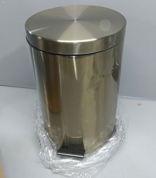 mDesign Tall 30 Liter / 7 Gallon Large Round Metal Lidded Step Trash Can, Thin Compact Garbage Bin with Removable Liner Bucket for Bathroom, Kitchen, Craft Room, Office, Garage - Soft Brass It has a small dent ...you can see in the pic