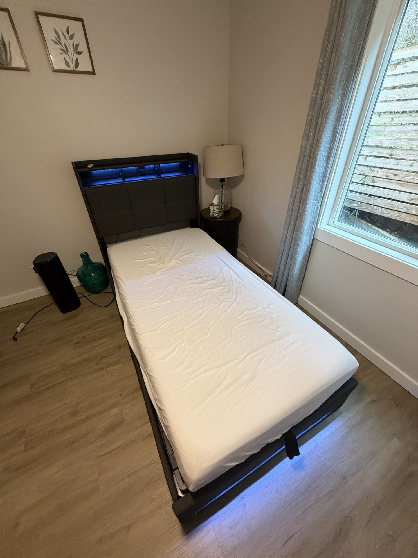 ***OBO*** Pick up only. Originally paid: $230 on Amazon for Bedframe. $100 on Amazon for Mattress. Was our Spare bed. Used approximately 3 times in past 12 months. Fabric Bed frame. Power headboard (see photo). Lifts with a strap and has 2 air supports for assistance. Has significant storage underneath bed. Overall Bedframe measurements: 46 inch tall (headboard) 12 inch tall (footboard) About 42 inch wide About 84 inch long. Mattress is twin size 6 inch foam mattress. Selling with bed. Anything in photo that is not bedframe or mattress is not for sale and not included.
