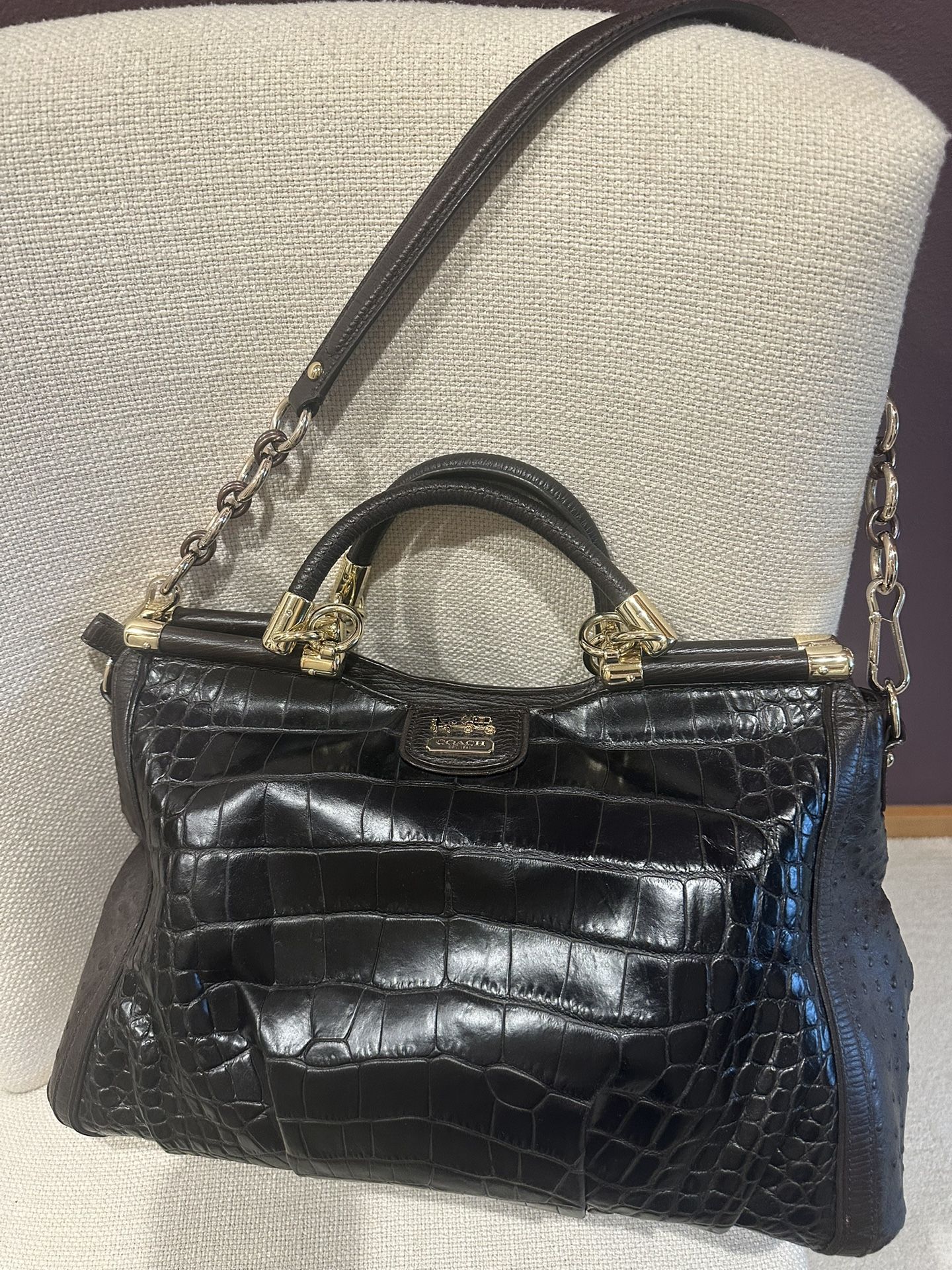 Elegant and timeless Coach handbag crafted from black croc-embossed leather with smooth leather side panels. Features structured silhouette with rolled top handles, gold-tone hardware, and signature Coach logo plaque. Includes a detachable leather-and-chain shoulder strap for versatile hand-carry or shoulder wear. Brand: Coach Color: Dark Brown Material: Croc-embossed leather with smooth leather accents Gold-tone hardware Top handles + removable shoulder strap Secure top closure Spacious interior for daily essentials Condition: Gently used, clean and well cared for with normal light wear. Excellent Condition Perfect for work, evening outings, or everyday polished style. A classic, versatile Coach bag that elevates any outfit.