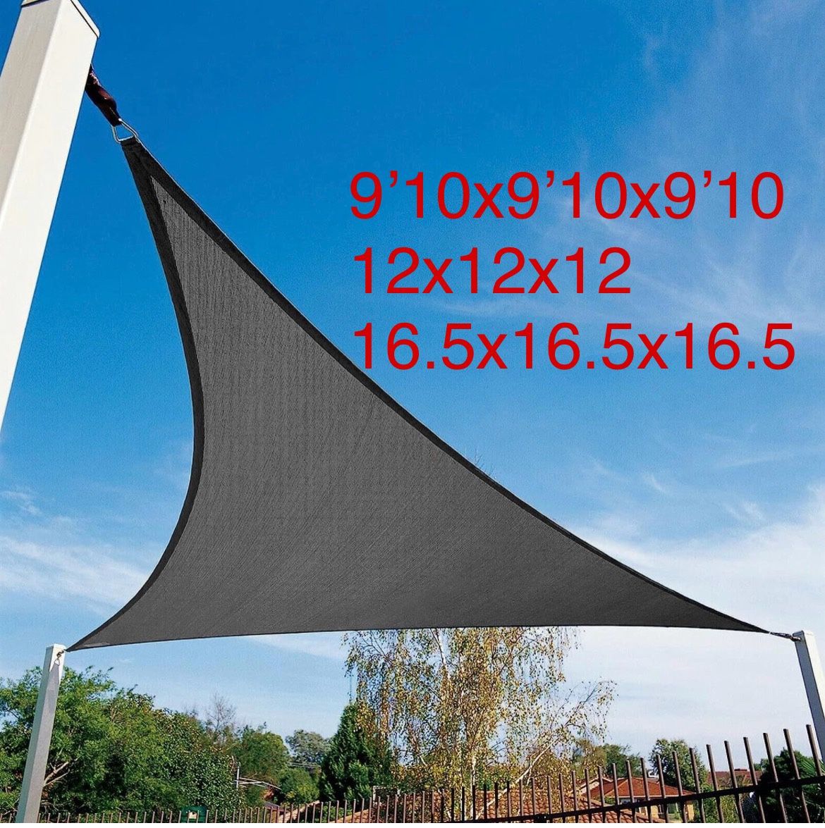 We carry different size different colors Triangle 9'10'' x 9'10'' x 9'10'' π²12 12' x 12' x 12' π²15 16'5'' x 16'5'' x 16'5'' π²20 Retangular/square 10' x 13' π²25 12' x 12' π²30 12' x 16' π²35 13'x20' π²50 Colors: Light blue Dark blue Red Grey Sand yellow Cream